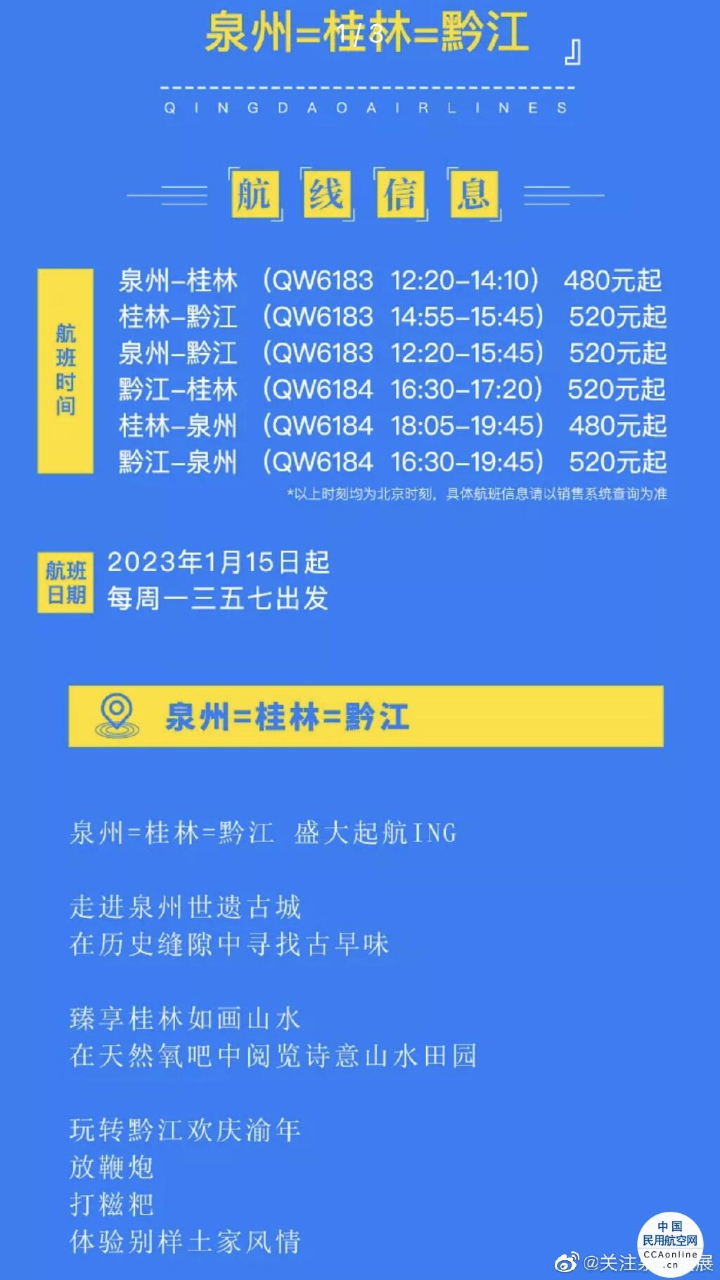 青岛航空1月15日起,新开泉州=桂林=黔江航线 航空运输要闻 航线航班 23年1月10日 编辑 通讯员mk 取消关注 关注 私信 青岛航空1月15日起,新开航线:泉州=桂林=黔江,每周一三五七出发。 青岛航空
