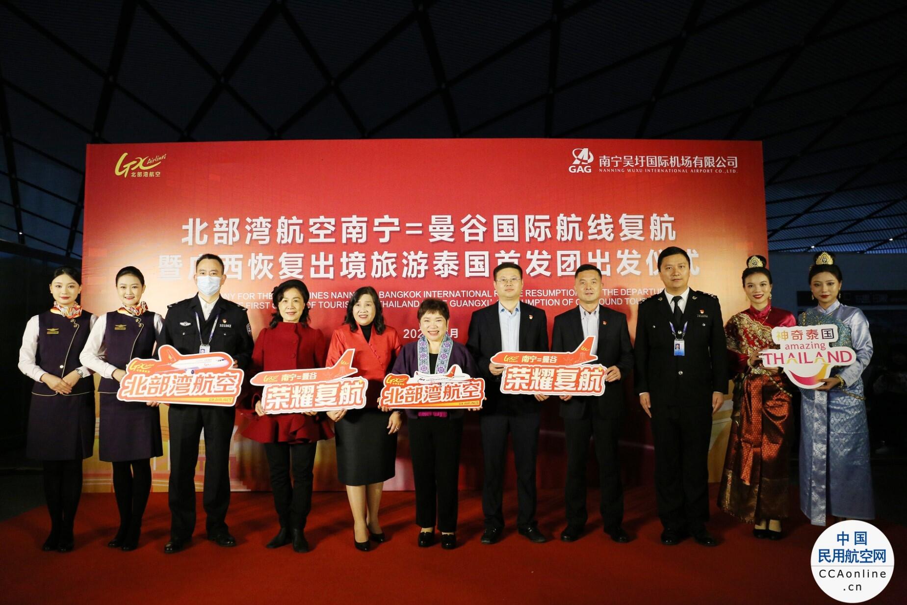 中国民用航空网讯(通讯员 张言坚)2023年2月6日,南宁吴圩国际机场T2航站楼出发大厅内热闹非凡,海航航空旗下北部湾航空联合南宁机场共同举行南宁=曼谷航线复航暨广西恢复出境旅游泰国首发团出发仪式。泰国驻南宁总领事馆总领事彬嘉玛·塔维她雅浓、北部湾航空总裁牛麟、泰国国家旅游局昆明办事处处长素虹、南宁市文化广电和旅游局副局长林慧超、南宁吴圩国际机场副总经理苏文辉、南宁边检站政委文俊等众多嘉宾及媒体记者共同见证了这个重要的历史时刻。20时许,北部湾航空GX8907航班顺利从南宁机场起飞,搭载包括广西恢复出境旅游泰国首发团在内的159名旅客前往泰国曼谷,航班客座率超九成。
