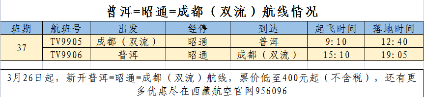成都⇌昭通⇌普洱,3月26日首飞 航空运输要闻 航线航班 来源:普洱发布 23年3月22日 编辑 通讯员mk 取消关注 关注 私信 3月26日起 西藏航空将执行夏秋航班飞行计划,航班换季后,西藏航空将新开成都(双流)⇌昭通⇌普洱航班。 该航班将于3月26日首航,每周三、周日执飞。在成都的街头走一走,到昭通观赏山水美景,再到普洱品味茶咖醇香,春和景明,来一场说走就走的旅行。 西藏航空昭通机场
