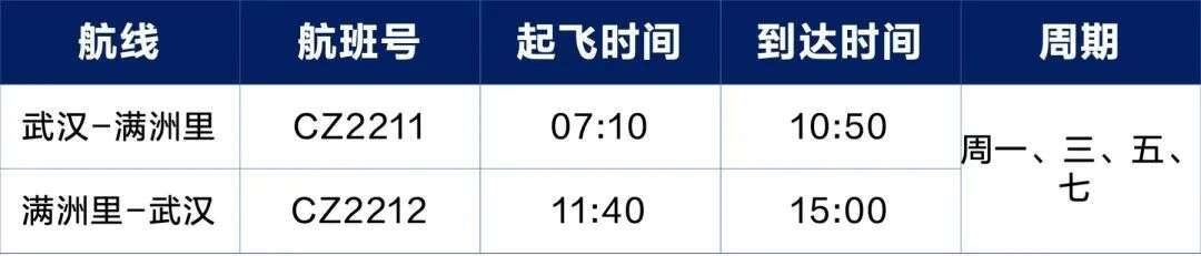 7月10日起,南航开通武汉-满洲里航线 航空运输要闻 航线航班 23年7月7日 编辑 通讯员mk 取消关注 关注 私信 为满足旅客暑期出行需求,南航计划从7月10日开始,新开武汉-满洲里直飞航线,每周四班! 武汉-满洲里航线信息 武汉=满洲里航线即将于7月10日开航,每逢周一、周三、周五、周日各一班。 去程信息 去程航班号为CZ2211,起飞时刻为北京时间07:10,降落时刻为北京时间10:50。 回程信息 回程航班号为CZ2212,起飞时刻是北京时间11:40,降落时刻为北京时间15:00。 *时刻信息仅供参考,请以实际查询为准 南方航空