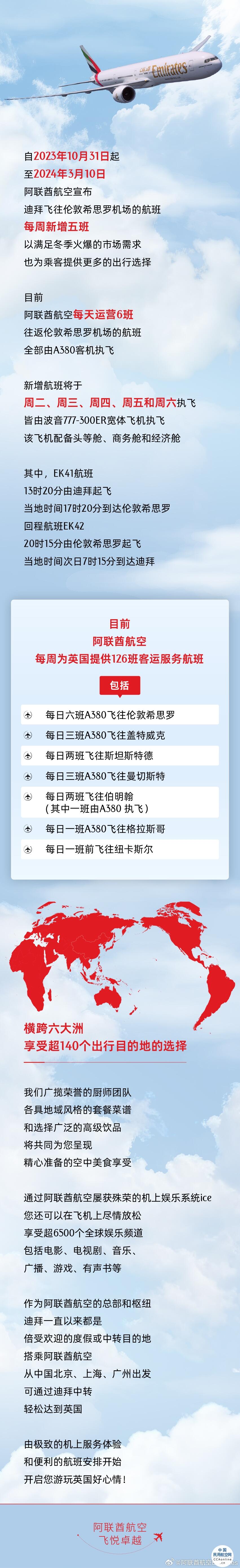 阿联酋航空迪拜-伦敦希思罗航线冬季将额外增加每周5班 航空运输要闻 航线航班 来源:阿联酋航空 23年8月18日 编辑 通讯员mk 取消关注 关注 私信 2023年10月31日起至2024年3月10日,阿联酋航空【迪拜往返伦敦希思罗机场】的客运服务每周将额外增加5班,新增航班将于周二、周三、周四、周五和周六运营,全部由波音777-300ER宽体飞机执飞。点击下图,了解航班时刻和更多信息。 目前,阿联酋航空运营网络广泛覆盖六大洲140余个目的地。乘客可从中国内地北京、上海、广州出发,经迪拜无缝转机,轻松达到英国。 阿联酋航空,飞悦卓越! 阿联酋航空