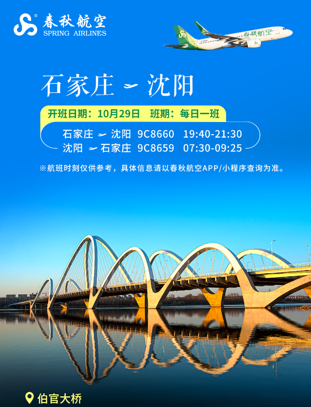 为迎接冬春换季,春秋航空根据季节和市场需求变化,优化调整市场结构和航线网络布局,满足石家庄市民出行需求,并对热门航线推出诚意十足的特价: