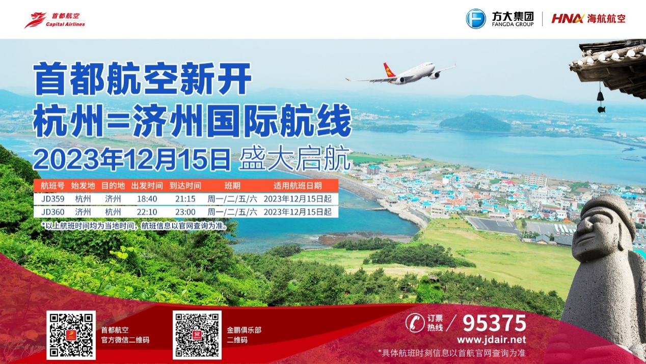 据了解,首都航空杭州=济州国际航线将于12月15日盛大开航。航线采用空客A320窄体客机执飞,每周执飞4班往返航班,班期为周一、周二、周五、周六。去程航班号为JD359,计划于18:40从杭州起飞,当地时间21:15抵达韩国济州岛;返程航班号为JD360,计划于当地时间22:10从济州起飞,飞行时间为1小时20分,北京时间23:00到达杭州。具体航班信息以实际查询为准。