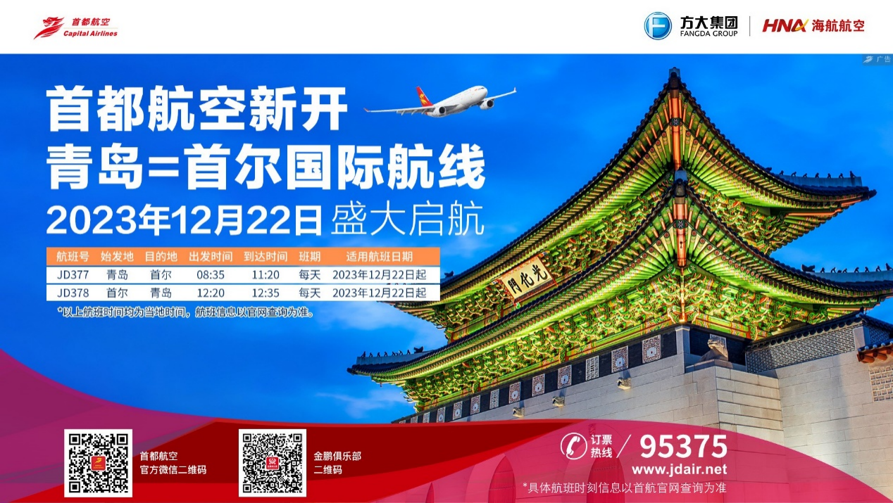 同时,首都航空青岛=首尔国际航线计划于12月22日开航,每天一班。去程航班号为JD377,计划于08:35从青岛起飞,当地时间11:20抵达首尔;返程航班号为JD378,计划于当地时间12:20从首尔起飞,到达青岛时间为12:35。具体航班信息以实际查询为准。