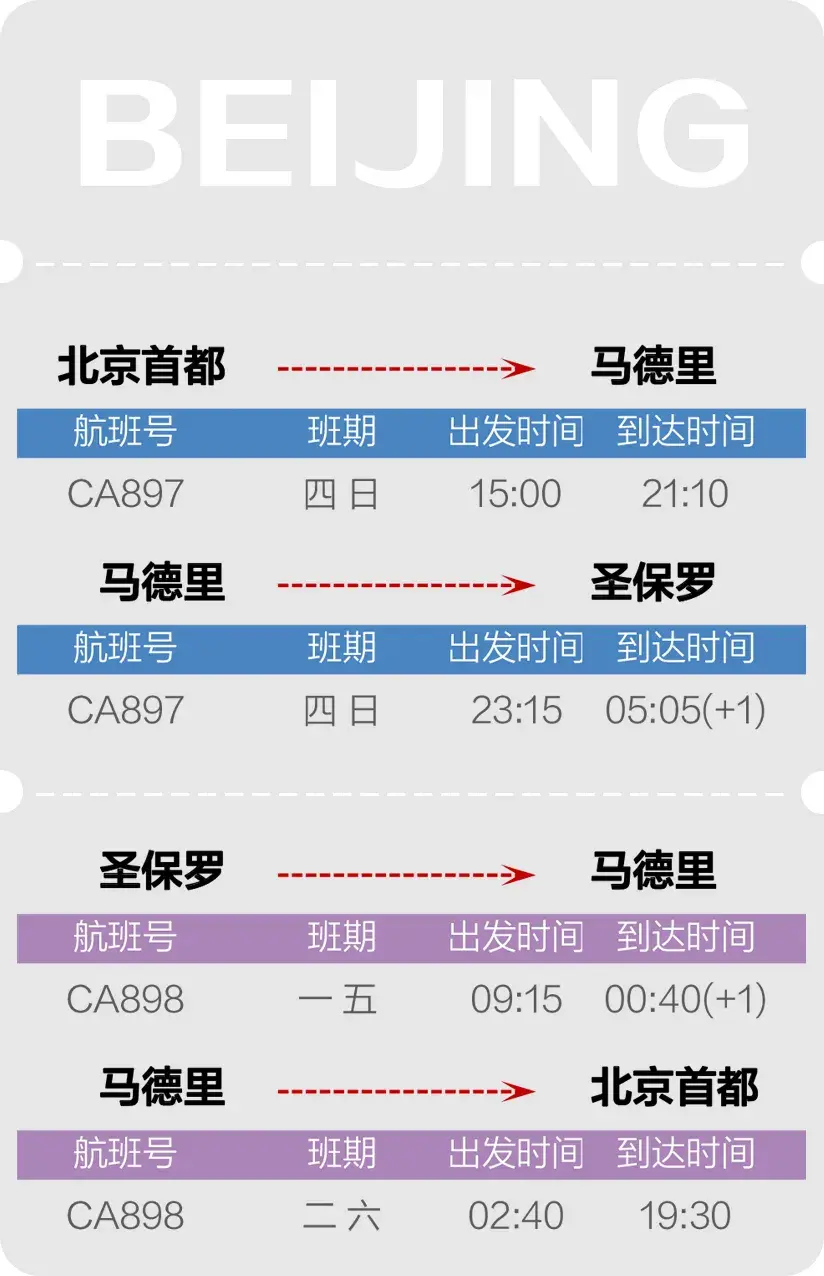 4月28日,国航北京-马德里-圣保罗航班复航 航空运输要闻 航线航班 24年4月11日 编辑 通讯员mk 取消关注 关注 私信 2024年4月28日起,国航将恢复北京-马德里-圣保罗航班运行,每周两班。具体信息如下: 执行日期:4月28日起 *以上时间均为当地时间,具体情况以实际执行为准。 国航航旅资讯国际航线航班