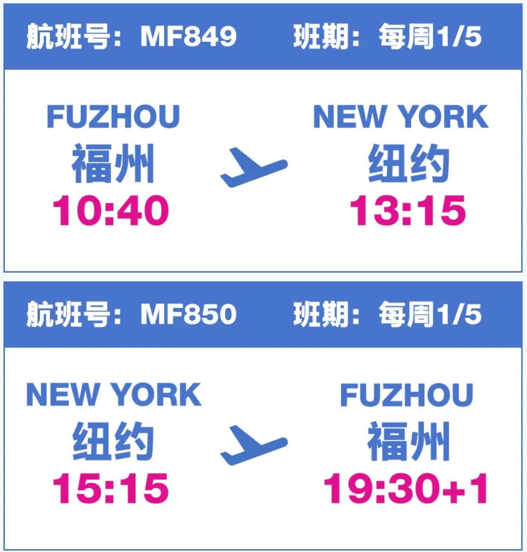 厦门航空福州-纽约航线正式复航 航空运输要闻 航线航班 24年4月28日 编辑 通讯员mk 取消关注 关注 私信 福州-纽约航线正式复航!5月20日起,每周2班,舒适直飞,畅游纽约! *以上时间均为当地时间,航班时刻请以实际查询为准 航旅资讯厦门航空国际航线航班