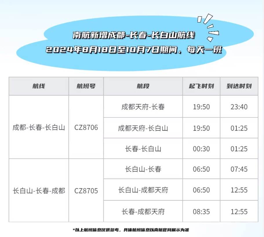 南航新开成都-长春-长白山航线 航空运输要闻 航线航班 24年8月8日 编辑 通讯员mk 取消关注 关注 私信 8月17日至10月7日期间,中国南方航空计划新开CZ8705/8706成都天府-长春-长白山航线,每天执飞一班。 航旅资讯南方航空