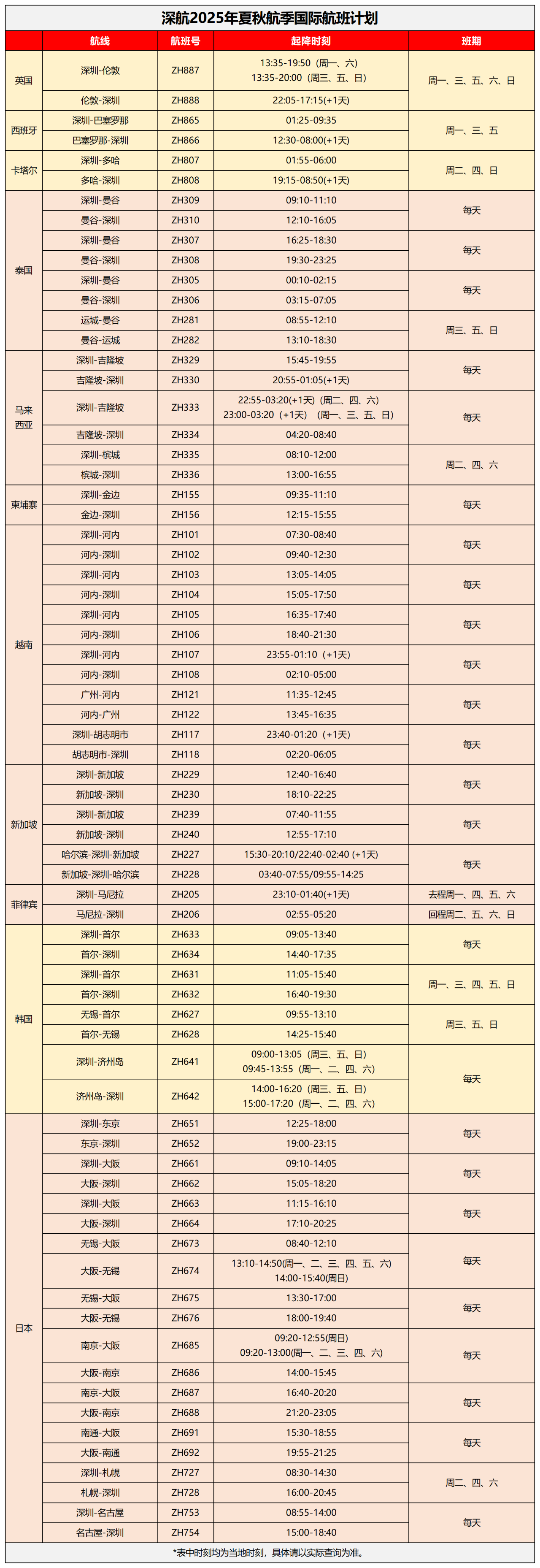 《深圳航空夏秋国际航班计划》发布 航空运输头条 航线航班 3月6日 编辑 通讯员mk 取消关注 关注 私信 深航2025年夏秋国际航班计划发布,将由3月30日起执行,快来先睹为快! 夏秋国际航班计划 换季后,哈尔滨=新加坡(经停深圳)航线、深圳=济州岛航线航班加密至每天一班! 航班换季深圳航空
