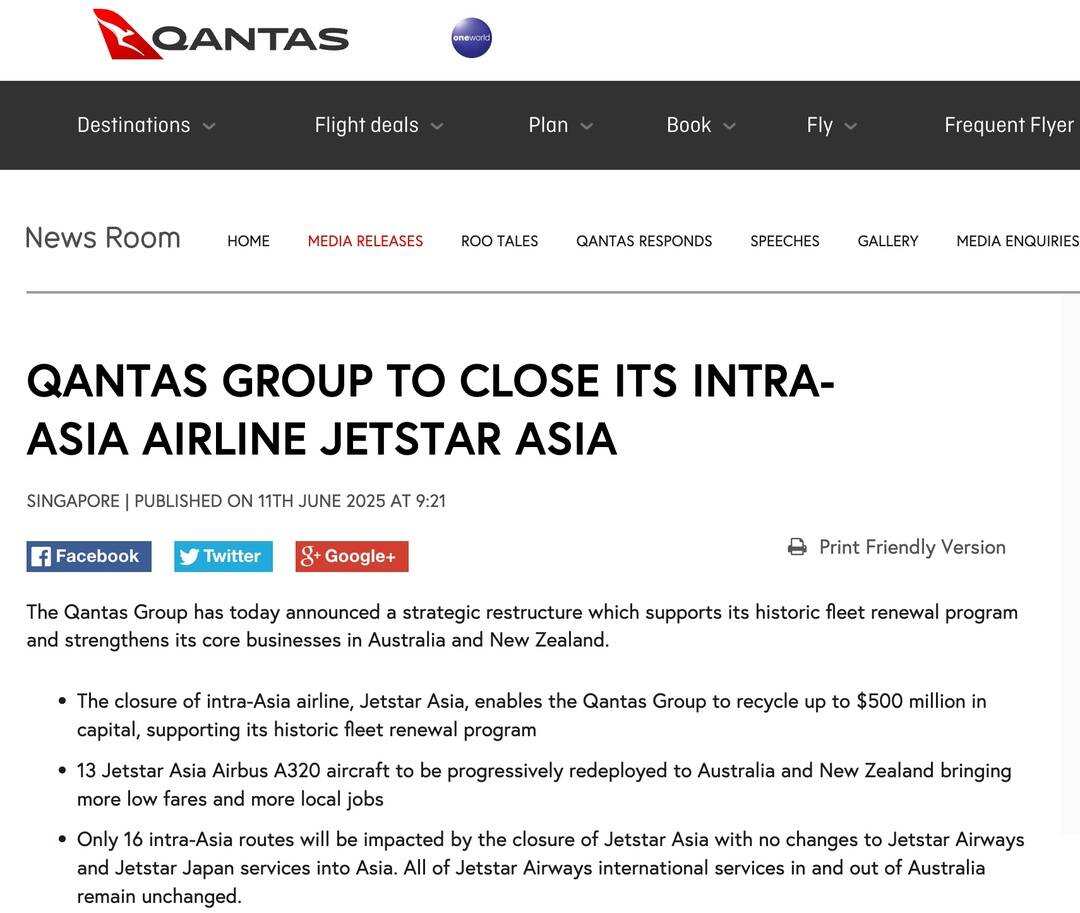 澳航拟关闭旗下廉航捷星亚洲 航空运输头条 25年6月11日 编辑 通讯员mk 取消关注 关注 私信 捷星亚洲航空公司发布消息称,旗下航班将陆续减少,并将在7月31日结束营业。 澳洲航空(Qantas)周三表示,将关闭旗下新加坡廉价航空公司捷星亚洲(Jetstar Asia),因供应商成本上升、机场费用上涨,以及低成本航空公司之间竞争加剧。捷星亚洲拥有的的13架空客A320飞机将逐步转向澳大利亚和新西兰。 该公司表示,此举将释放5亿澳元(约合3.264亿美元)的资本,让澳航能够投资于机队更新计划。 捷星亚洲