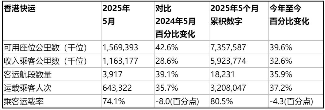 香港快运于2025年5月接载超过六十四万人次,载客量较2024年同月增加35.7%,可用座位公里数增加42.6%。在2025年首五个月,载客量较2024年同期增加了37.2%。