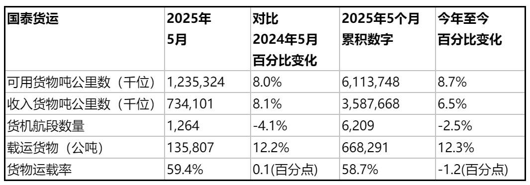国泰货运2025年5月的载货量较2024年同月增加12.2%。可用货物吨公里数按年增加8 % ,而运载率则按年增加0.1个百分点。在2025年首五个月,载货量较去年同期增加了12.3%。