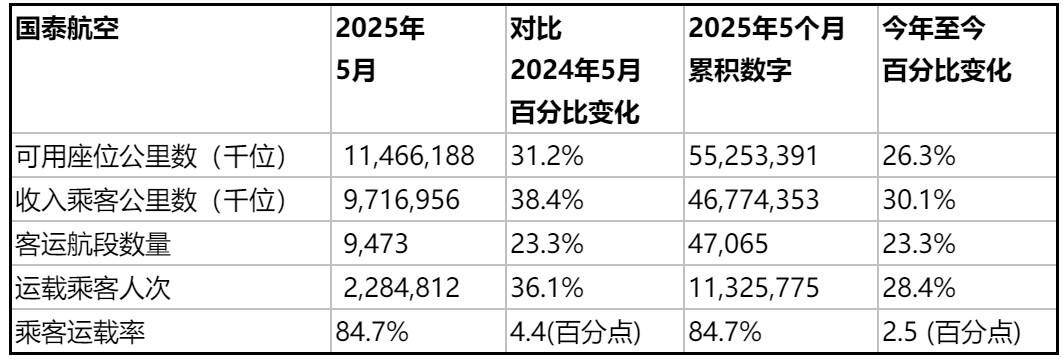 国泰航空于2025年5月份的载客量较2024年同月增加36.1%。可用座位公里数按年增加31.2%。在2025年首五个月,载客量较2024年同期增加了28.4%。