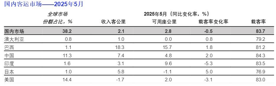 - 国内需求同比2024年5月增长2.1%。运力同比增长2.8%。载客率83.7%,同比2024年5月下降0.5 个百分点。