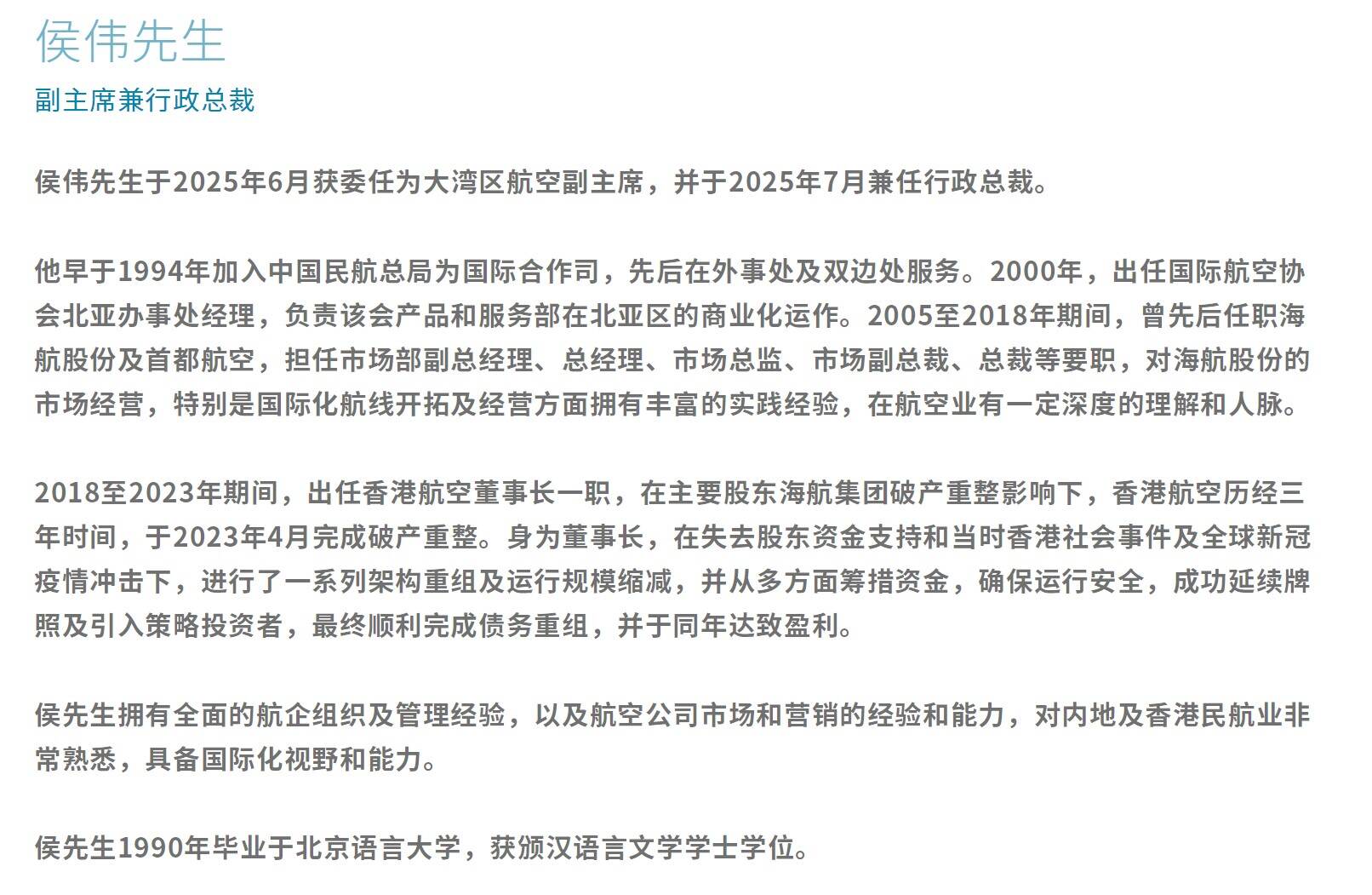 大湾区航空高层变动,侯伟出任行政总裁,曾志伟加入董事会 航空运输头条 25年7月10日 编辑 通讯员mk 取消关注 关注 私信 大湾区航空网站介绍,侯伟于今年6月获委任为大湾区航空副主席,并于7月兼任行政总裁,以接替早前辞去行政总裁一职的吴秀兰。此外,该公司委任香港资深艺人曾志伟为董事会成员。 民航人事变动大湾区航空