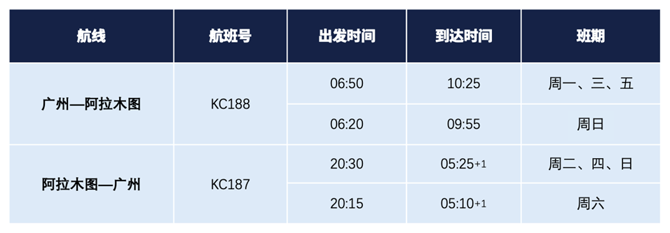 新增航班KC187于每周六20:15从阿拉木图出发,次日05:10到达广州,回程航班KC188于每周日06:20从广州出发,09:55分返回阿拉木图,以上均为当地时间。