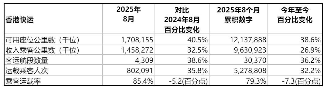 香港快运于2025年8月的载客人次及可用座位公里数,分别较2024年同月增加36%及41%。在2025年首八个月,载客量较2024年同期增加了32%。