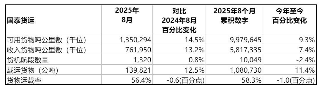 国泰货运2025年8月的载货量较2024年同月增加13%。可用货物吨公里数按年增加15%。在2025年首八个月,载货量较去年同期亦增加了11%。