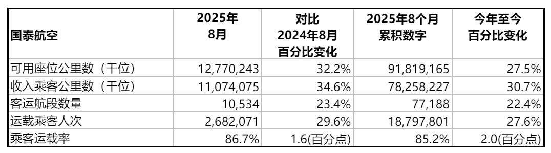 国泰航空于2025年8月份的载客量较2024年同月增加30%。可用座位公里数按年增加32%。在2025年首八个月,载客量较2024年同期增加了28%。