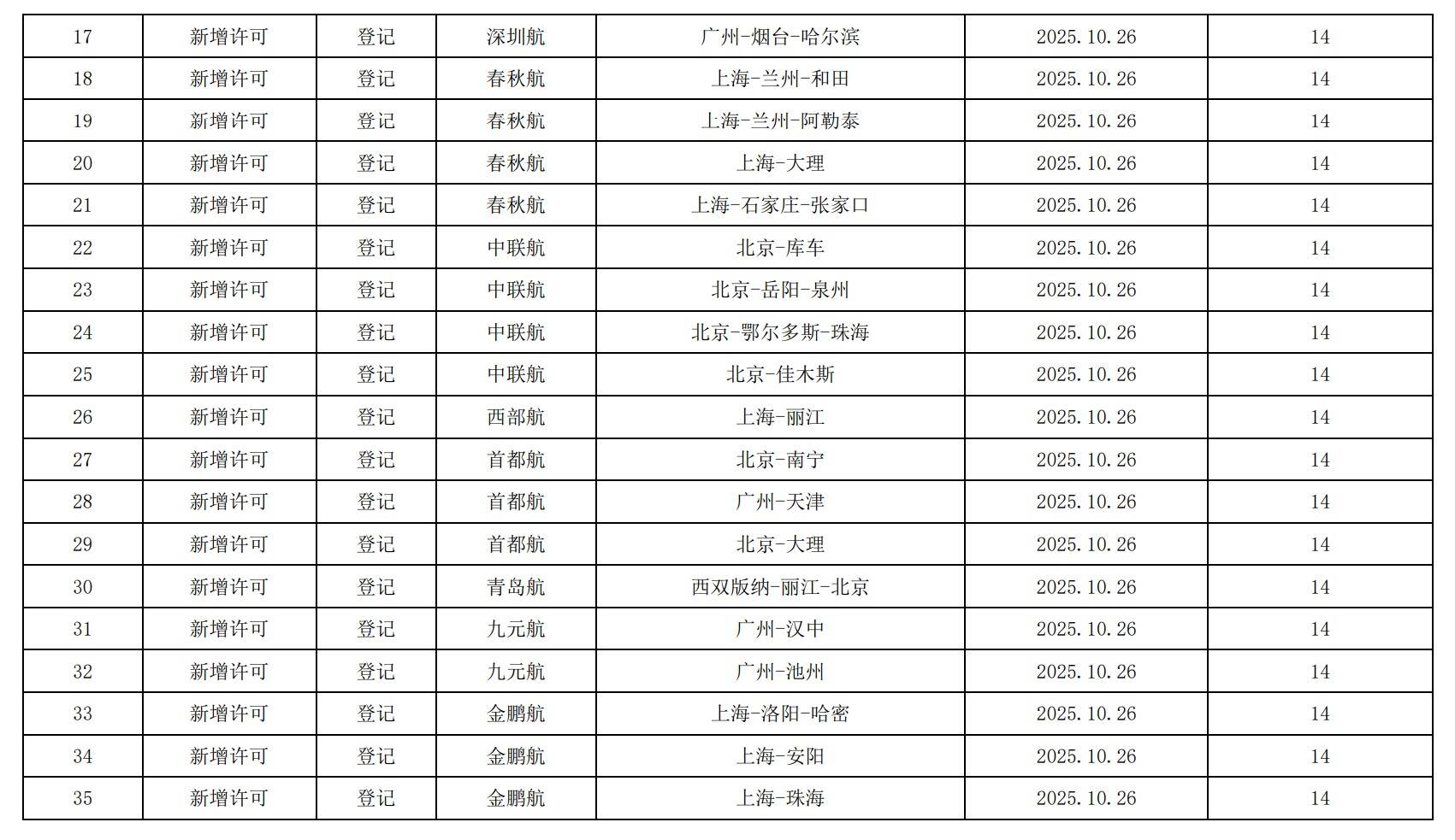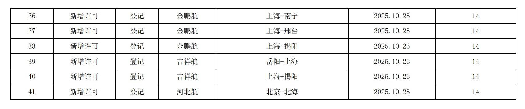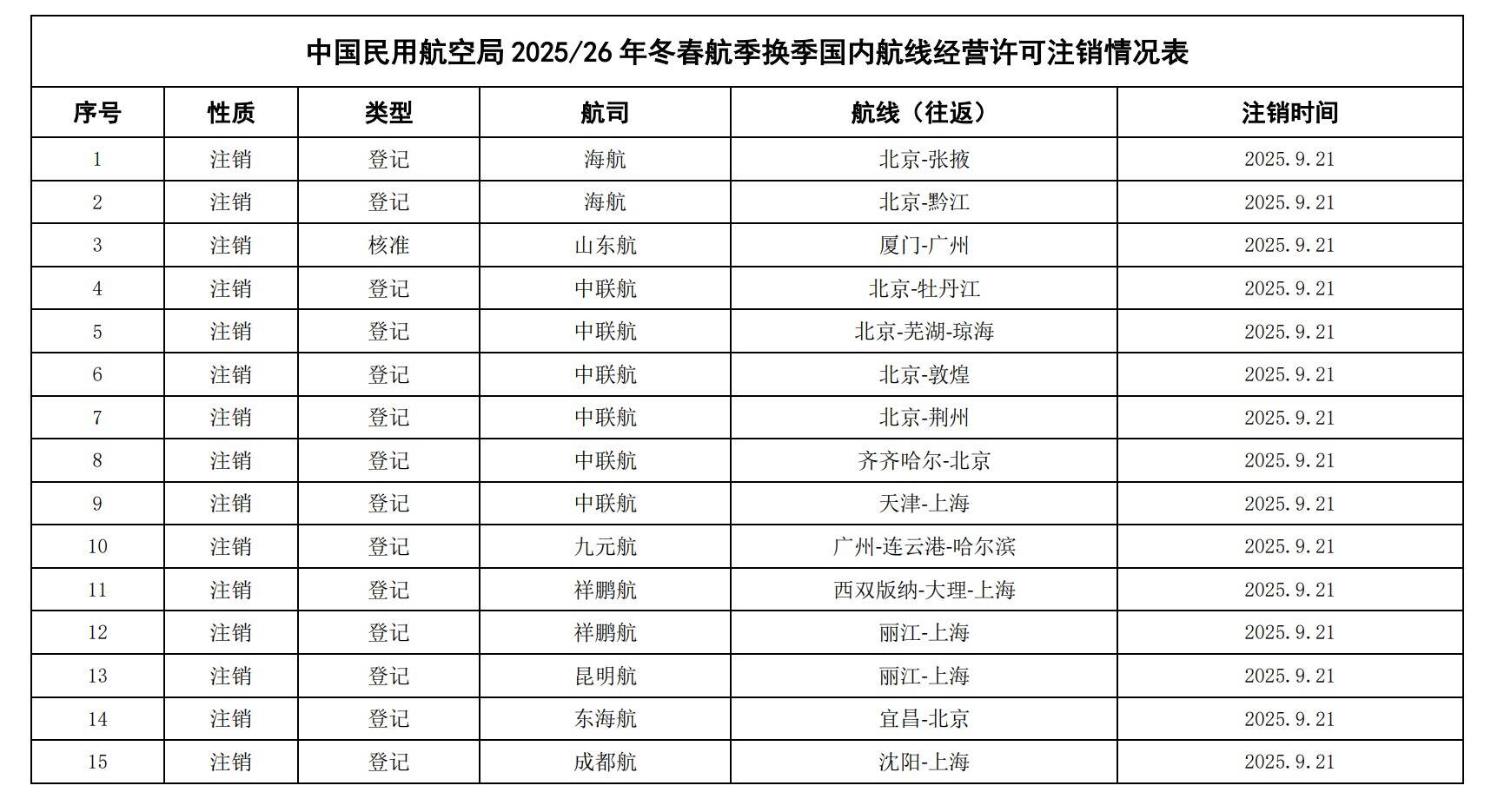 民航局2025/26年冬春航季换季颁发、注销国内航线经营许可信息通告