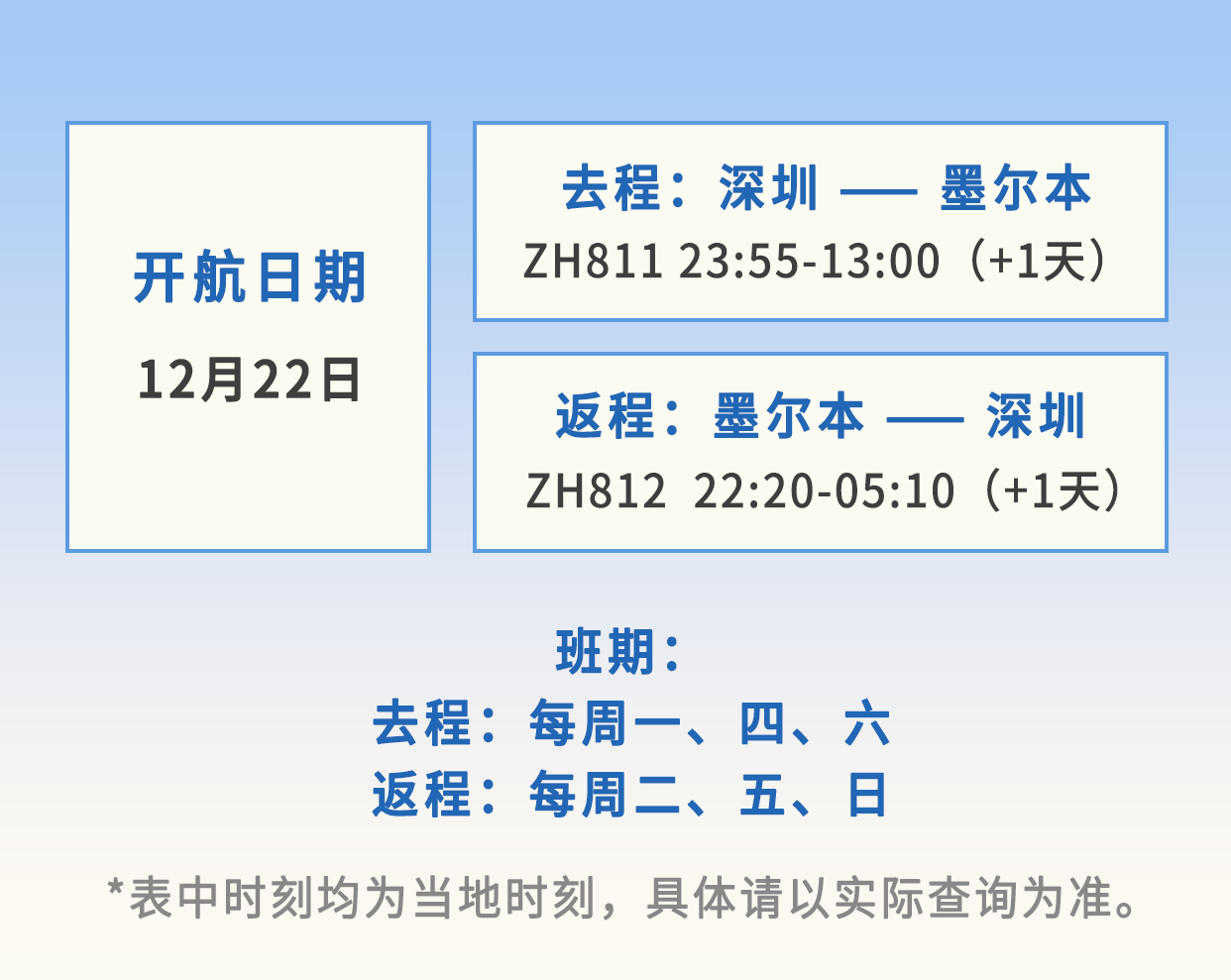 深圳航空2025冬春航季航班计划 航空运输头条 航线航班 10月20日 编辑 通讯员mk 取消关注 关注 私信 10月26日起 深航2025冬春航季航班计划正式执行! 航线网络再升级 新增、加密37条国内航线 新开深圳直飞墨尔本/海防国际航线! 新开航线 加密航线 12月22日起,深圳=墨尔本航线盛大开航 带你穿越南半球 邂逅澳洲的萌趣诗篇~ 11月1日起,深圳=海防航线正式开航 带你漫步越南老街 徜徉“海上桂林”下龙湾~ 目前深航国际航线网络已覆盖伦敦、 巴塞罗那、多哈等全球19个城市 新航季与你玩转全球 与世界为邻~ 相关推荐: 东航恢复中印航线:上海浦东⇌德里航班11月9日开飞 海南航空冬春航班换季,新增往返国内航线100余条 东海航空新增、加密多条航线 航旅资讯航班换季深圳航空