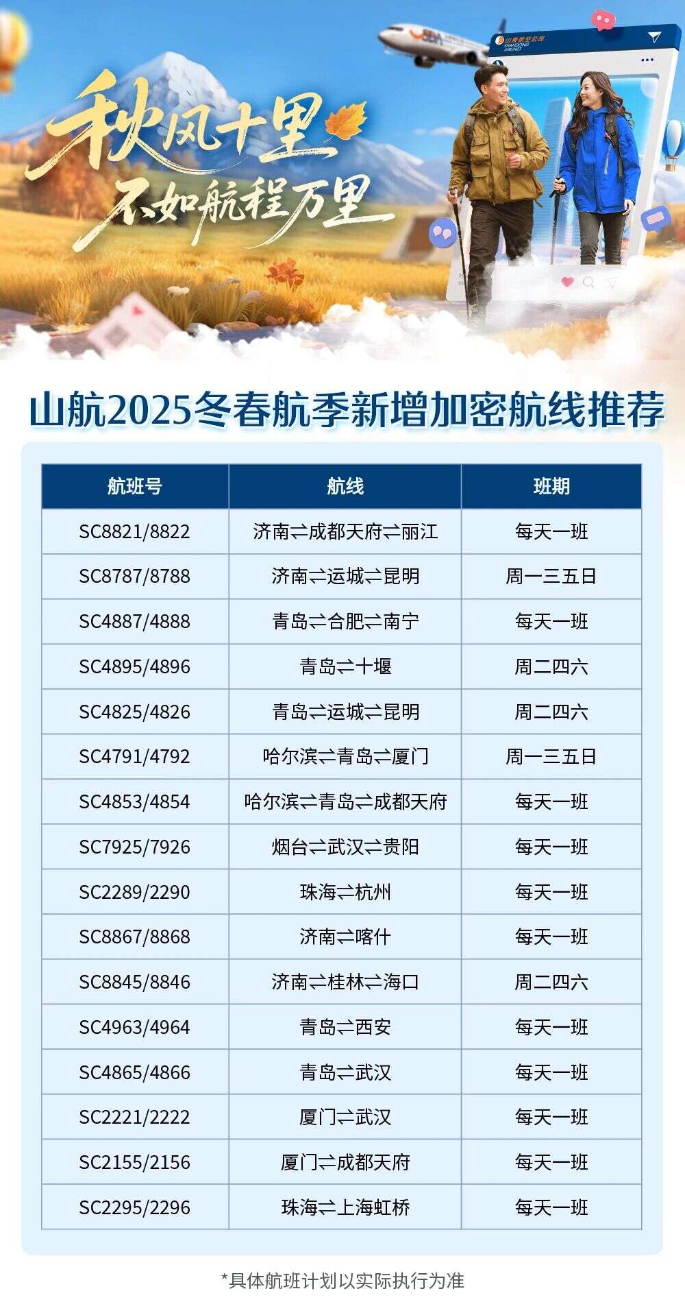 10月26日起,全国民航将正式执行冬春航季航班计划。山航计划投入134架飞机运力,围绕中南、西南、东北及华东区域市场新增和加密多条航线,为旅客出行提供更多选择。