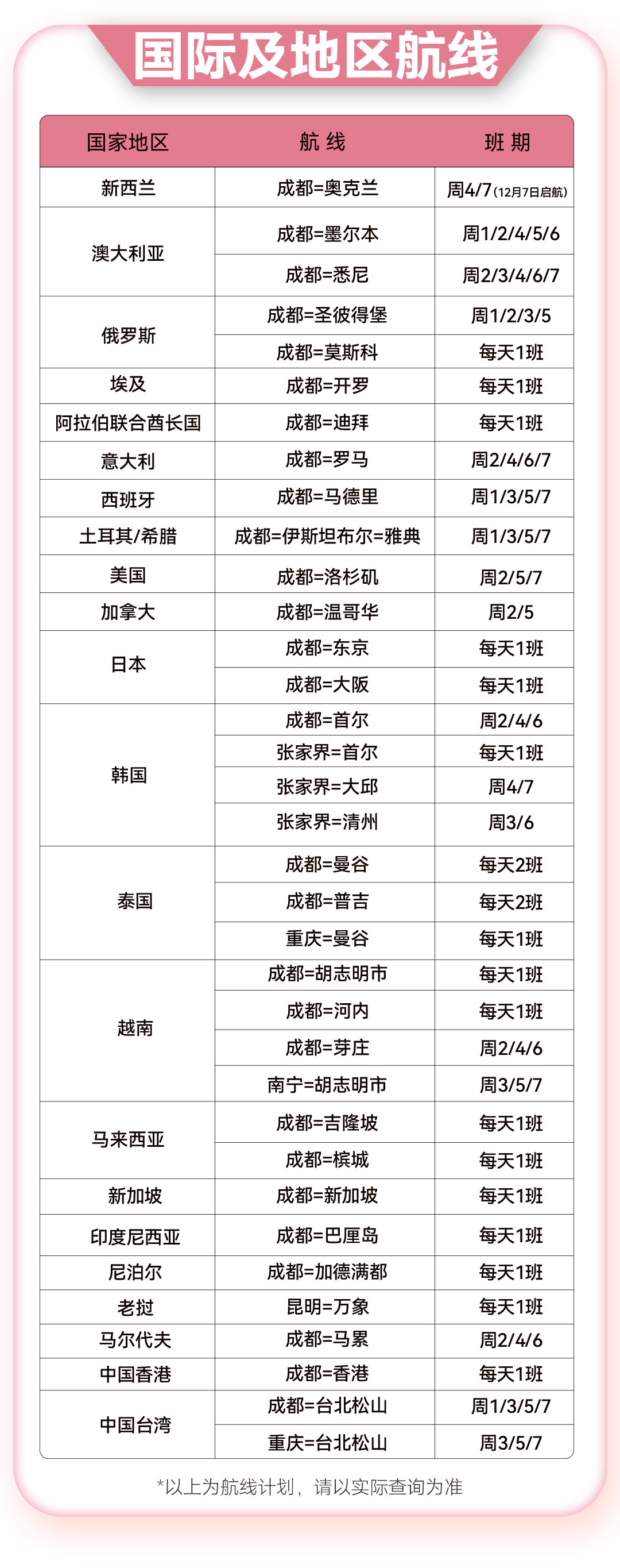 川航国际及地区航班计划也已出炉,将执飞32条国际航线和3条港台地区航线。其中,成都=奥克兰直飞航线计划于12月7日恢复。
