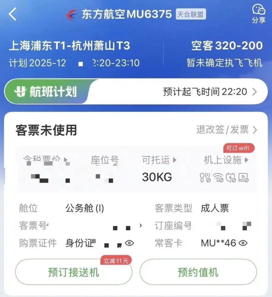 杭州市民徐先生在澳大利亚工作,看到东航重启杭州往返上海的航班,他第一时间就购买了一张12月24日上海浦东飞杭州的公务舱机票。