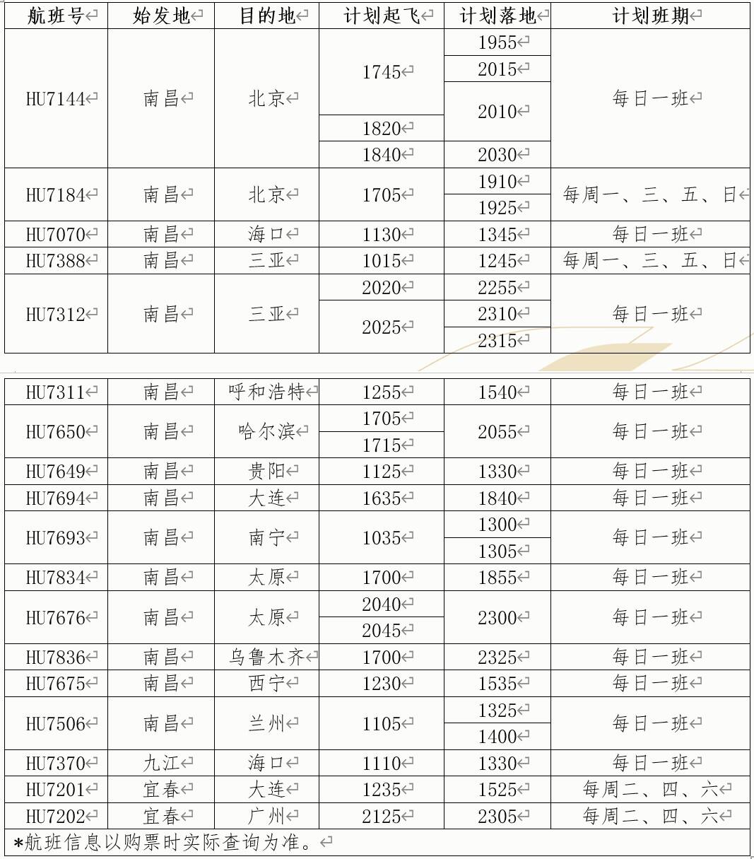 新航季中,海南航空计划在江西省内南昌、九江和宜春三地共运营15条国内航线,通达北京、海口、三亚、广州、南宁、大连、乌鲁木齐、西宁、呼和浩特等国内热门公商务及旅游城市,每周计划执行出港航班112班。后续,海南航空将根据市场需求适时增投运力,旅客可通过海南航空官网及APP、微信公众号及小程序、服务热线95339、各直属售票处及授权代理查询及购票。
