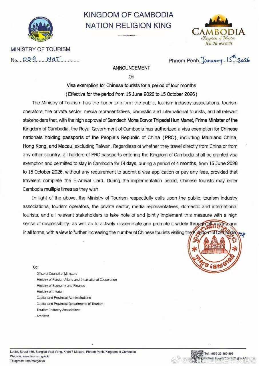 柬埔寨对中国游客免签试点 航空运输头条 1月16日 编辑 通讯员mk 取消关注 关注 私信 1月15日,柬埔寨王国政府旅游部正式发布《关于对中国游客施行为期四个月免签试点的公告》。从2026年6月15日至10月15日试点期内,中国公民无需提前申请签证,亦无需支付签证费用,仅需填写电子入境卡,即可入境柬埔寨,单次入境可停留最多14天。 免签入境