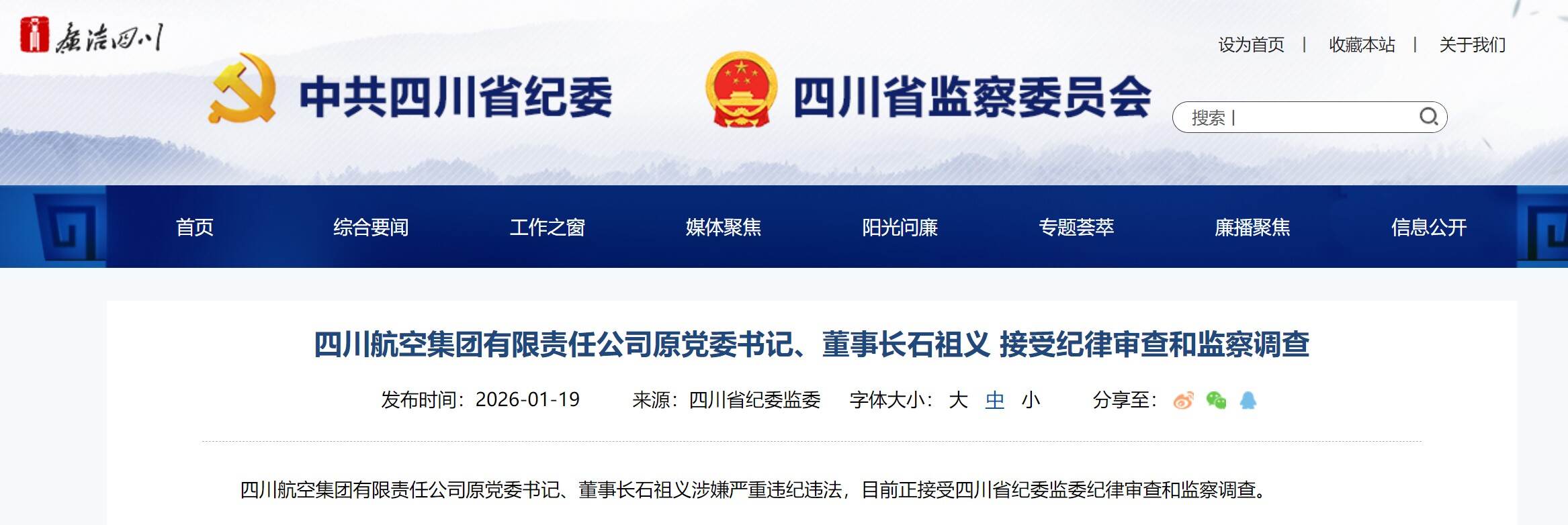 据四川省纪委监委消息:四川航空集团有限责任公司原党委书记、董事长石祖义涉嫌严重违纪违法,目前正接受四川省纪委监委纪律审查和监察调查。