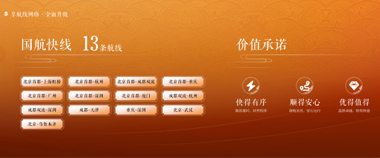 此外,国航已完成旗下“快线”产品的整合升级,“国航快线”覆盖13条航线,以更高频次的航班安排和更具品质感的尊享服务,进一步提升核心航线运行效率与出行体验。