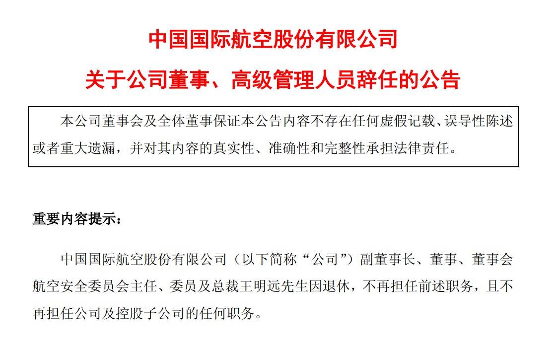 3月5日,中国国航发布公告,因退休,王明远先生(王先生)于2026年3月5日辞任本公司副董事长、执行董事、董事会航空安全委员会主任、委员及总裁,于同日生效。