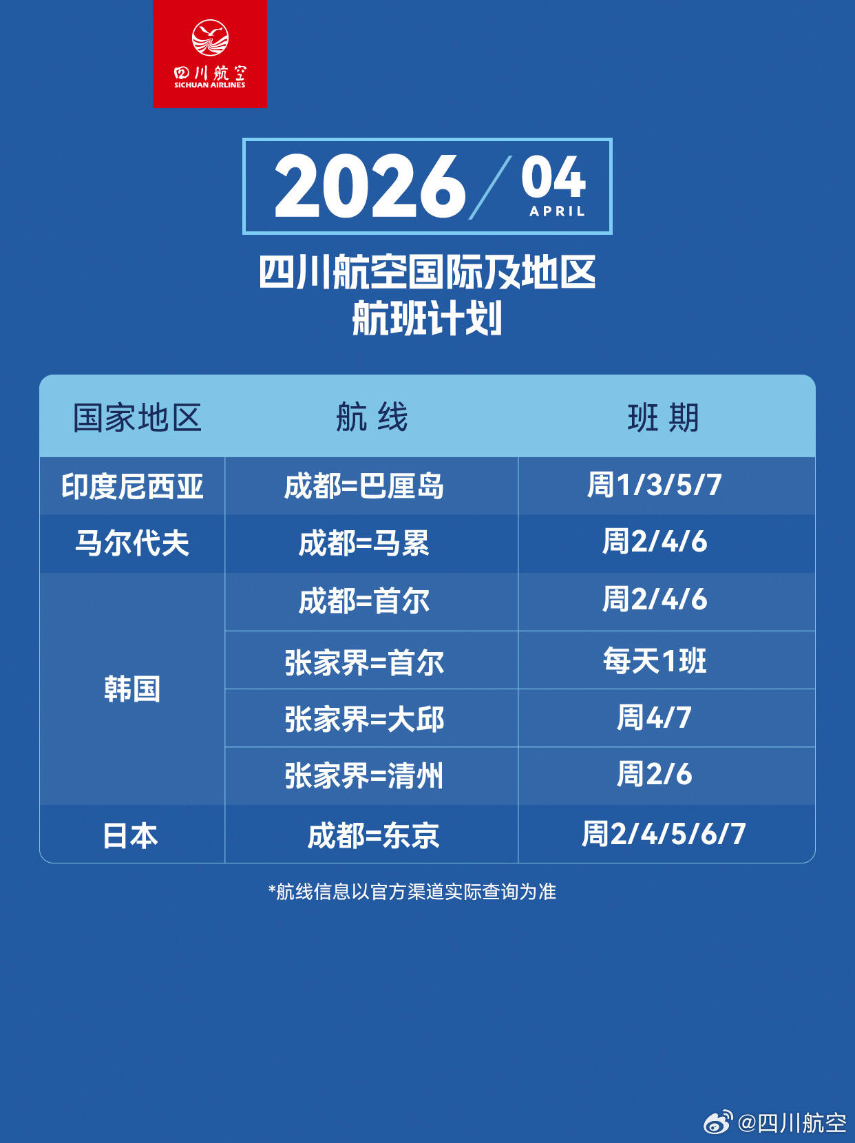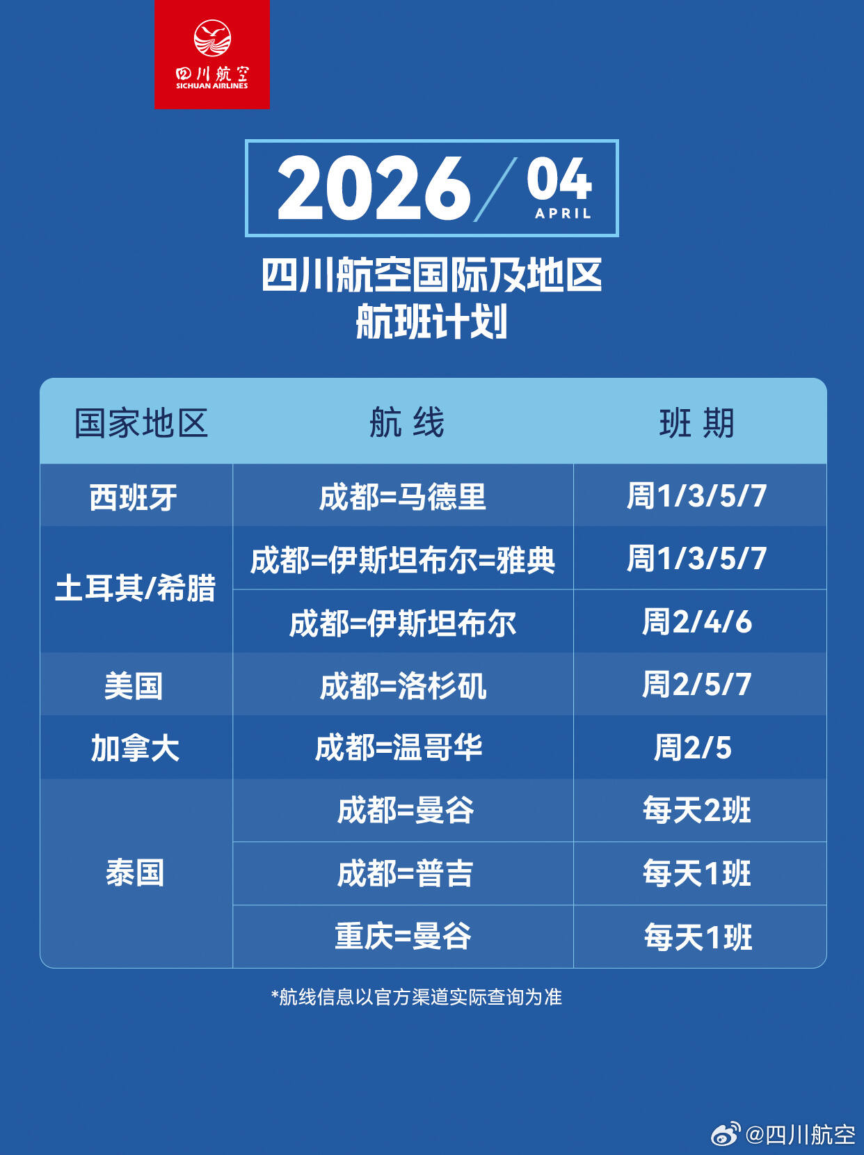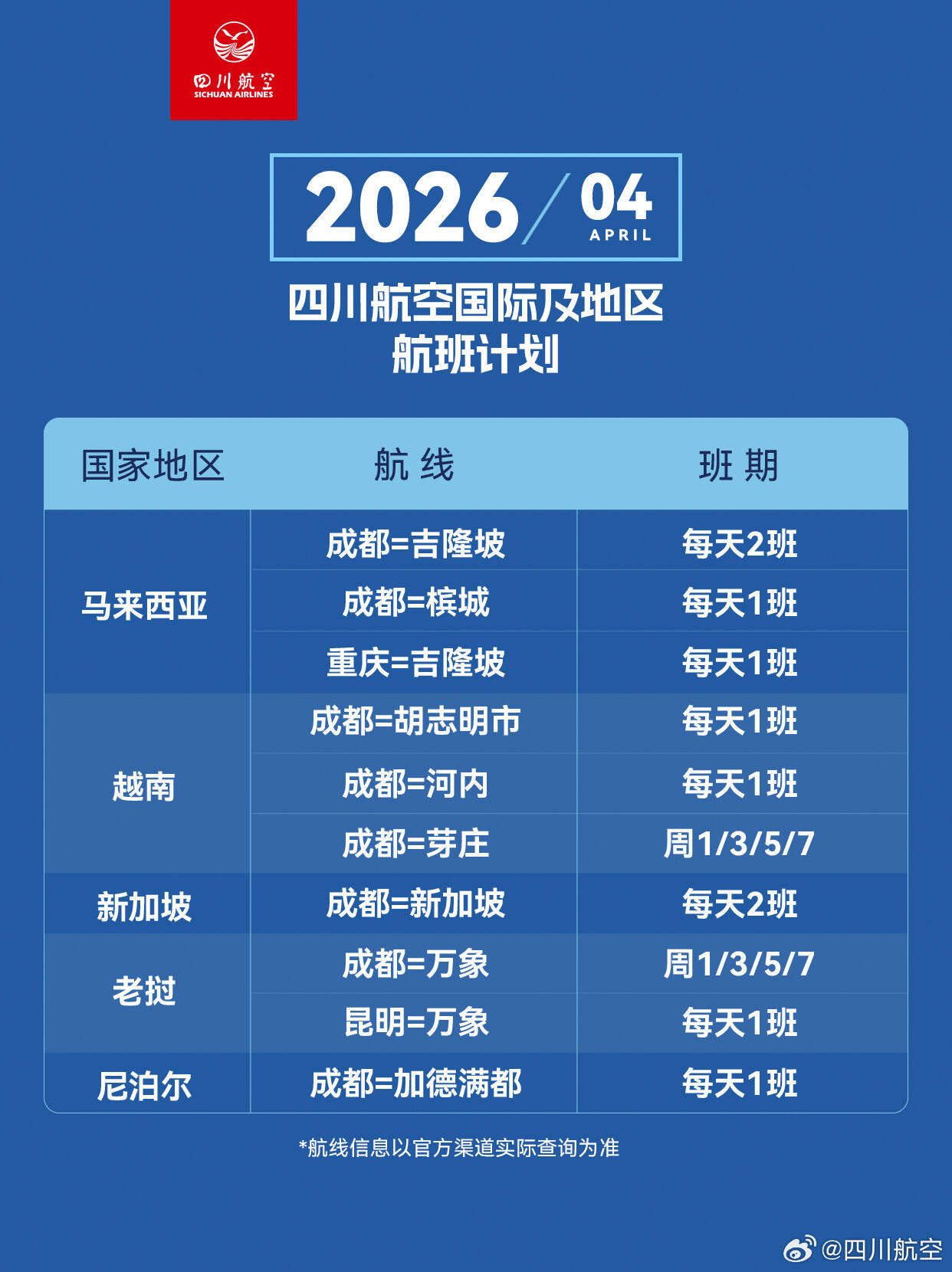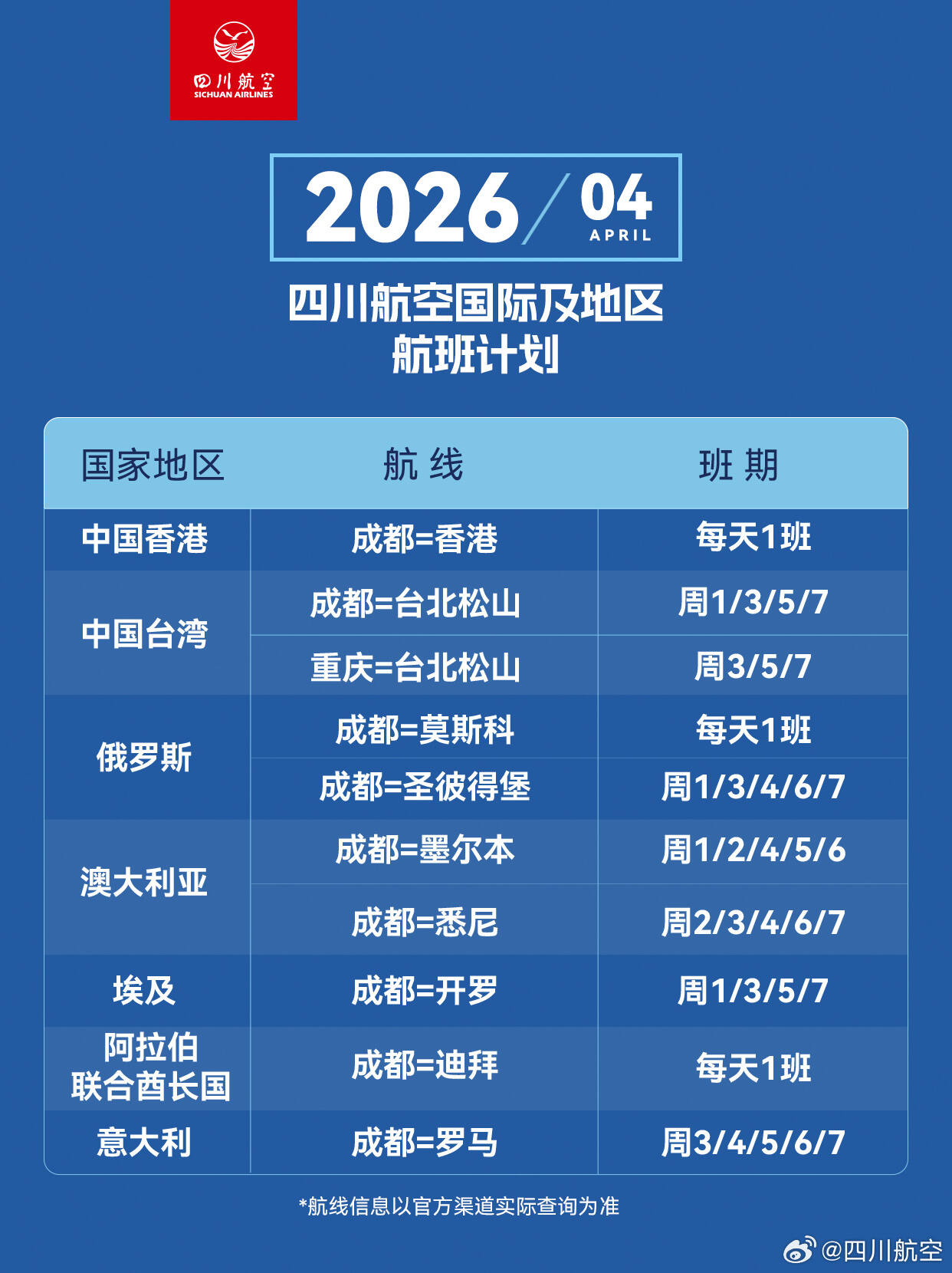 川航2026年4月国际及地区航班计划 航空运输头条 航线航班 2小时前 编辑 通讯员mk 取消关注 关注 私信 川航4月计划执飞📌32条国际航线📌3条港台地区航线 相关推荐: 海南航空深圳—开罗航线每周三班 架起中埃“空中丝路” 直飞北欧!东航上海浦东—斯德哥尔摩航线6月22日复航 部分航司已恢复迪拜赴华航线 国航利雅得航线航班恢复运行 东航6月20日起新开“上海—阿德莱德”直飞航线 四川航空国际航线航班