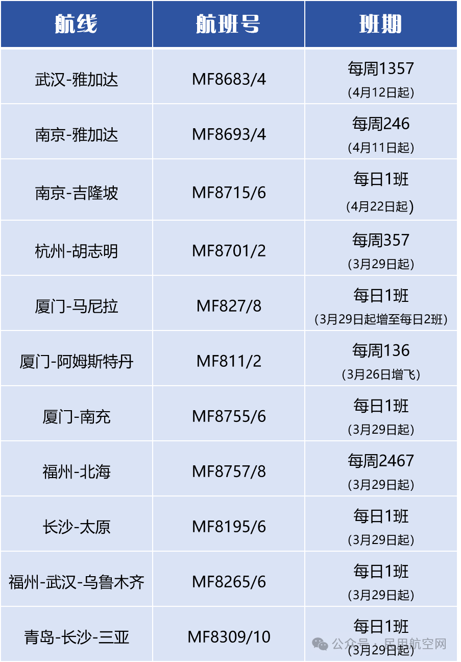 3月29日起,厦门航空开启新航季 航空运输头条 航线航班 3月18日 编辑 通讯员mk 取消关注 关注 私信 3月29日起,厦门航空开启新航季! 新开武汉⇋雅加达、南京⇋雅加达、 南京⇋吉隆坡、杭州⇋胡志明等多条航线 *如遇航班变动,请以实际查询为准。 相关推荐: 新增90余条国内航线!海南航空2026年夏秋航季焕新出发 新海航福州航空夏秋航季优化网络布局 多条航线通达新疆、内蒙古 增运力,扩航线,新海航乌鲁木齐航空全力迎接2026年夏航季 厦航新开东南亚航线 南航2026年夏秋航季新开加密多条国际航线 航班换季厦门航空