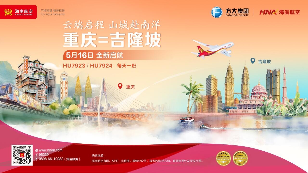 中国民用航空网讯(通讯员:刘帅 张瀚兮 作者单位:海南航空控股股份有限公司)新海航旗下海南航空计划于2026年5月16日起开通重庆—吉隆坡直飞航线。这是海南航空在重庆执飞的第二条直飞东南亚的航线,该航线的开通将进一步促进中马两国在经贸、人文等领域的交流与合作。