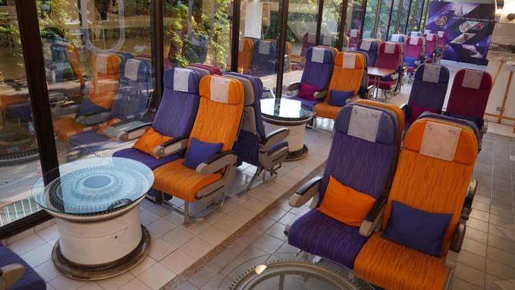 据外媒报道,该餐厅由泰航曼谷总部的一间咖啡厅改装而成,内部装潢全部仿照飞机客舱结构进行,部分装饰来自飞机废弃零部件——飞机引擎、窗户、风扇叶片等,客人可扫描装饰上的二维码了解详细信息。