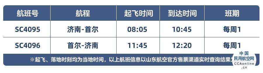 此次开飞的济南=首尔航线航班号SC4095/4096,每周一执行。去程于北京时间8点05分从济南出发,当地时间10点45分降落于首尔仁川国际机场;返程航班于当地时间11点45分起飞,北京时间12点20分飞抵济南。