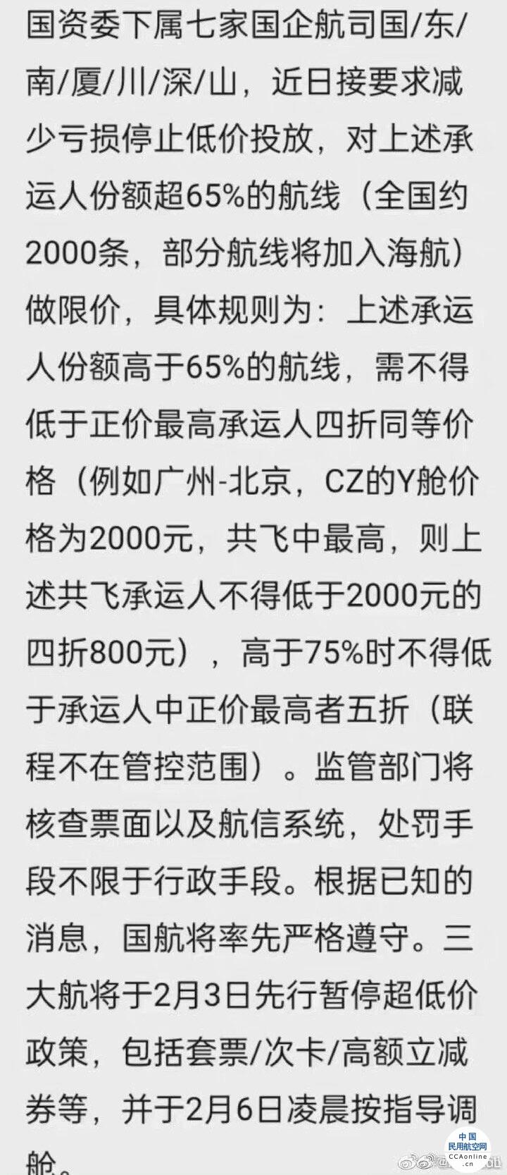 近日,网传7家国有航司部分航线的机票折扣率将被限制。三大航于2月3日先行暂停超低价政策,并于2月6日凌晨按指导调舱。