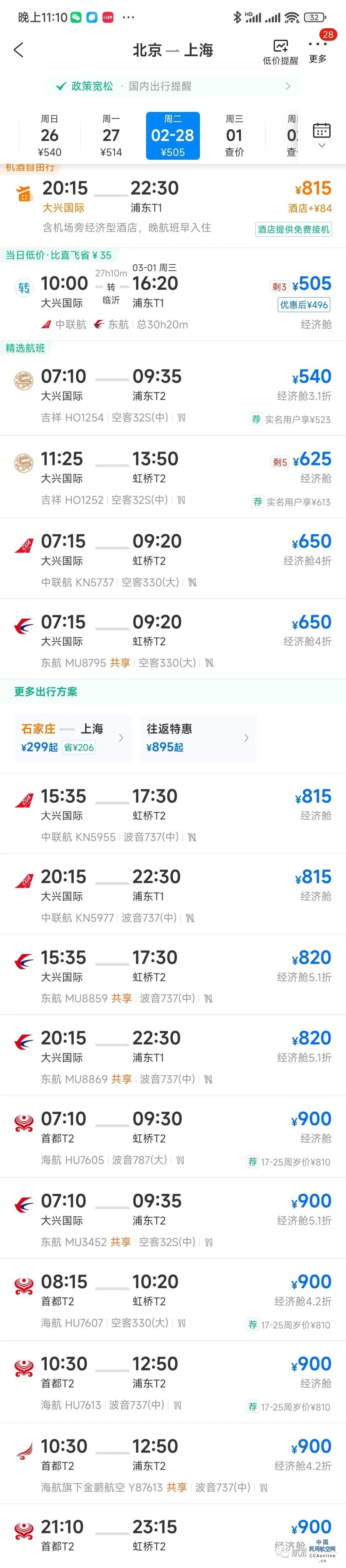 以京沪线为例,经查询发现,目前除吉祥航空外,其余航司实际承运的京沪线均不低于4折,包括低成本航空中联航。