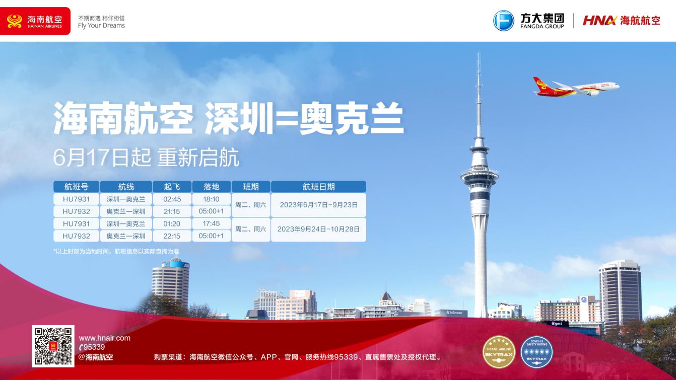 | HU7931 | A330 | 深圳—奥克兰 | 周二、周六 | 02:45 | 18:10 | 2023年6月17日—9月23日 |