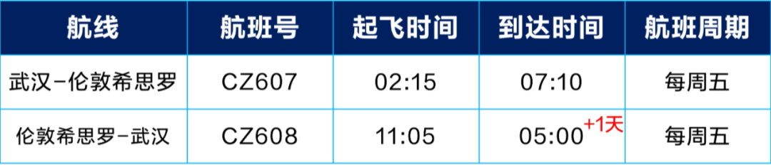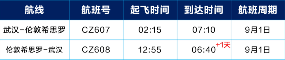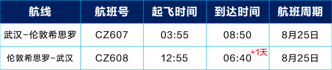 8月25日起,南航武汉直飞伦敦复航 航空运输头条 航线航班 23年6月25日 编辑 通讯员mk 取消关注 关注 私信 南航武汉直飞伦敦航线 计划8月25日起复航,每周五一班 武汉⇌伦敦时刻信息表 8月25日航班时刻 9月1日航班时刻 9月8日-9月29日航班时刻 *以上时刻均为当地时间,航班计划可能有所变化,请以南航官网、APP、微信小程序等官方渠道实际查询为准。 南方航空国际航线航班
