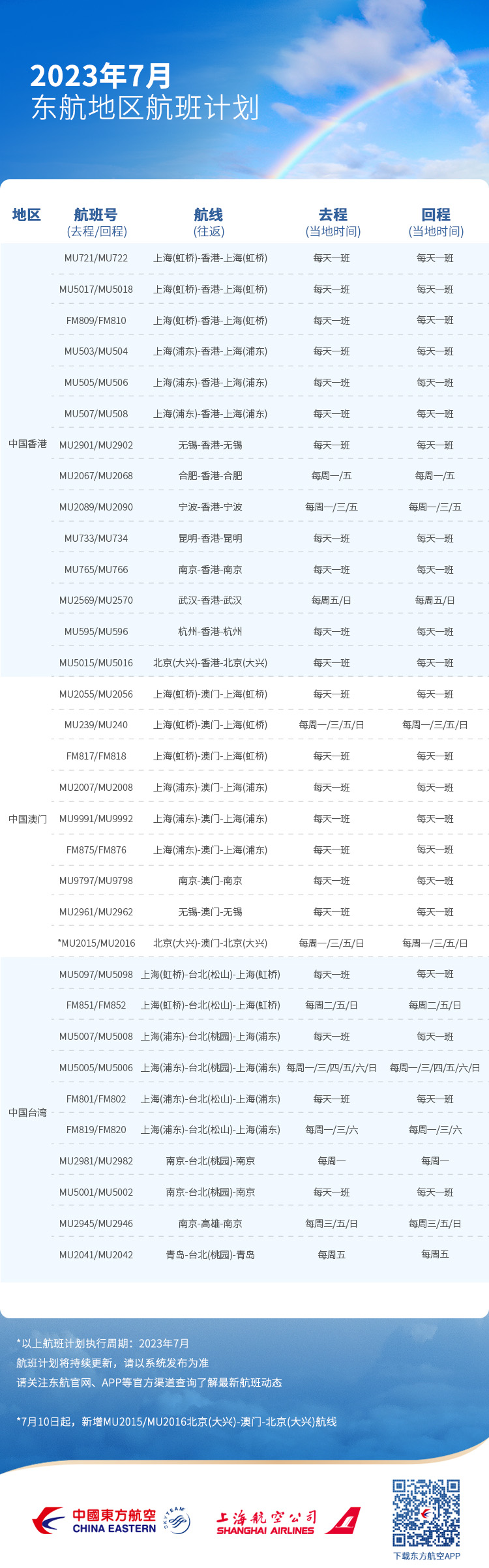 东航7月国际及地区航班计划 航空运输头条 航线航班 23年7月7日 编辑 通讯员mk 取消关注 关注 私信 近期,东航国际航线陆续复航 新增的国际航线也陆续上线 为暑期出境旅行增加更多便利 预计进入7月后,东航/上航 每周执行国际地区航线超过100条 起降架次超过1400班 航旅资讯东航国际航班计划