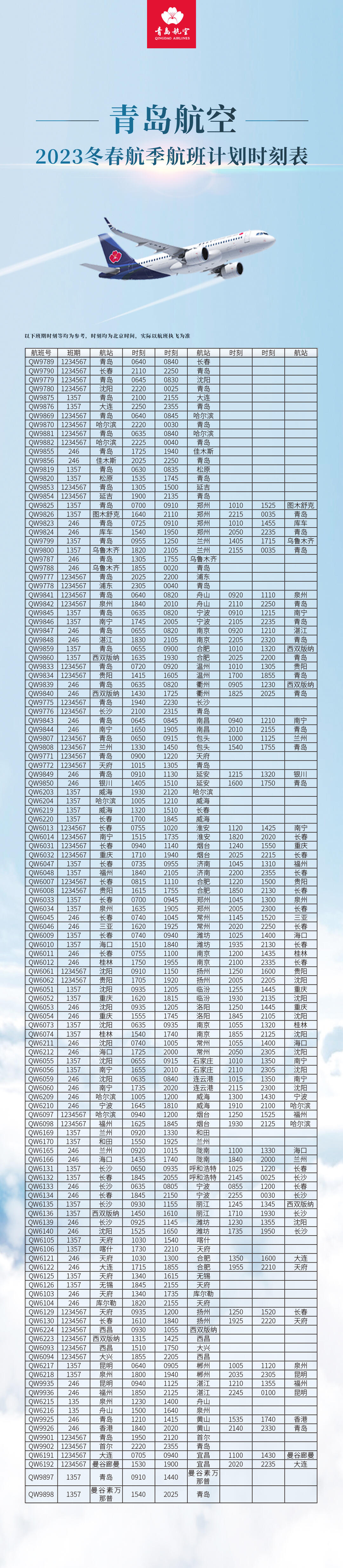 10月29日起,青岛航空将开始执行2023冬春航班计划。根据旅客出行需求和季节特点,青岛航空对航线网络进行了全面优化,将通达北京、上海、香港、韩国首尔、泰国曼谷等50余个国内国际航点。