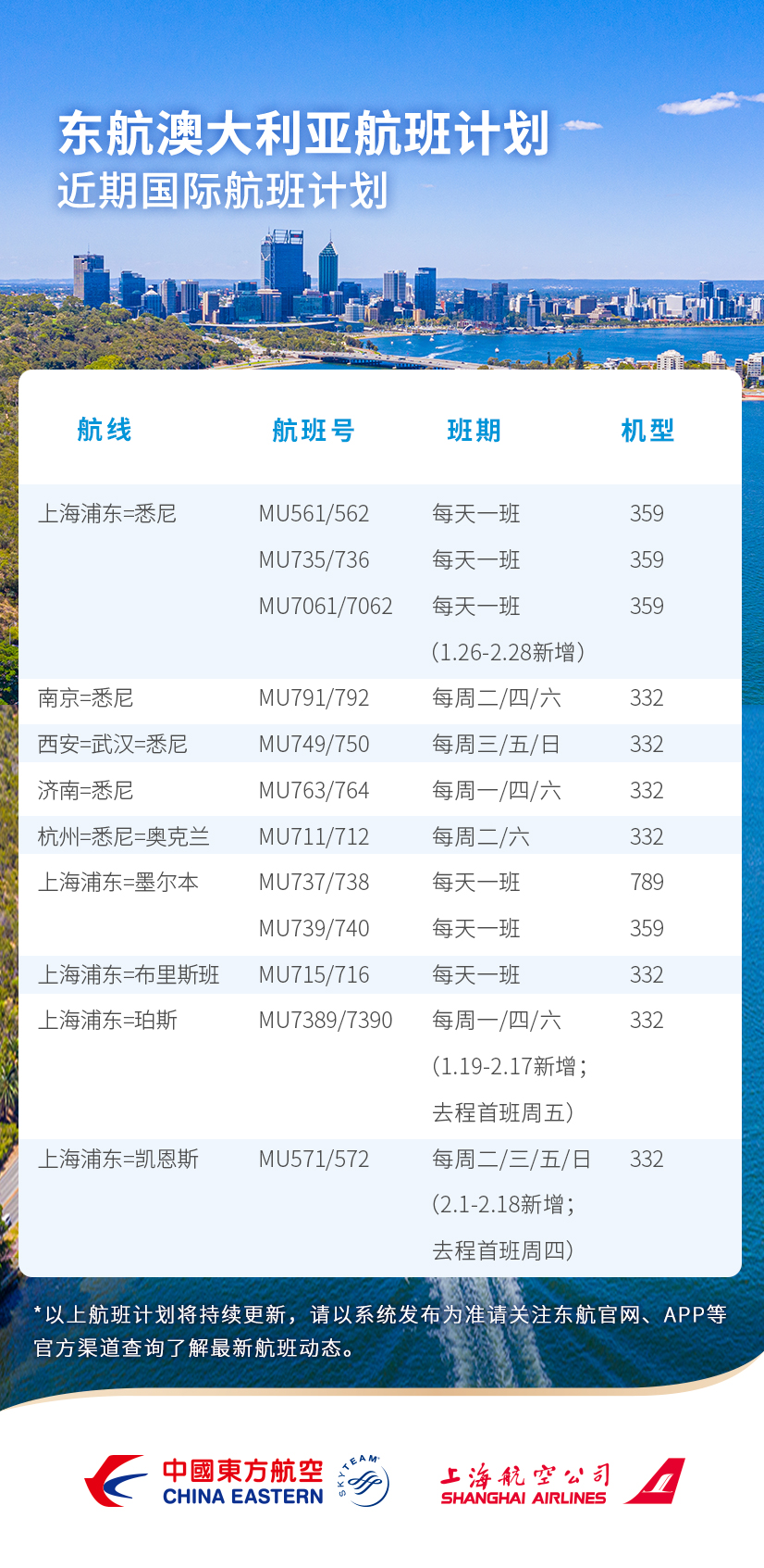 东航“上海-珀斯”直飞复航,附澳大利亚航班计划 航空运输头条 航线航班 24年1月26日 编辑 通讯员mk 取消关注 关注 私信 即日起-2024年2月17日,东航将限时恢复“上海-珀斯”直飞航线,旅客无需再从悉尼或墨尔本转机,即可直飞抵达温暖的西澳解锁更多精彩目的地,该航班将于每周一/四/六往返。 春运期间东航还将新增“上海-凯恩斯”直飞航线,并进一步增班“上海-悉尼”航线,东航中澳航线将加密至每周60班。 航旅资讯东航国际航线航班