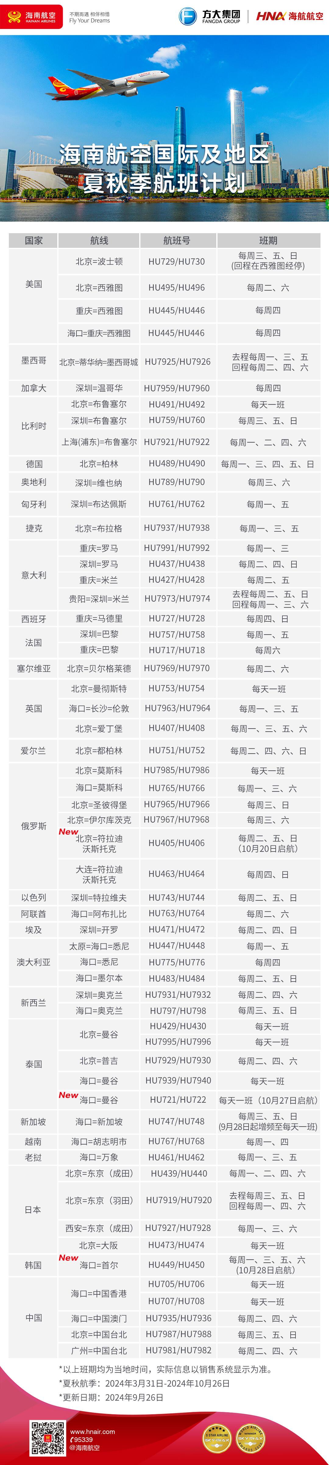 中国民用航空网讯(通讯员 霍琦、张瀚兮 作者单位:海南航空控股股份有限公司)海南航空计划于2024年10月28日起新开海口—首尔国际航线,这是海南航空在海口出港的第14条国际及地区航线。此条航线的开通,将搭建起海南地区赴韩的便捷桥梁,进一步促进海南自由贸易港建设。