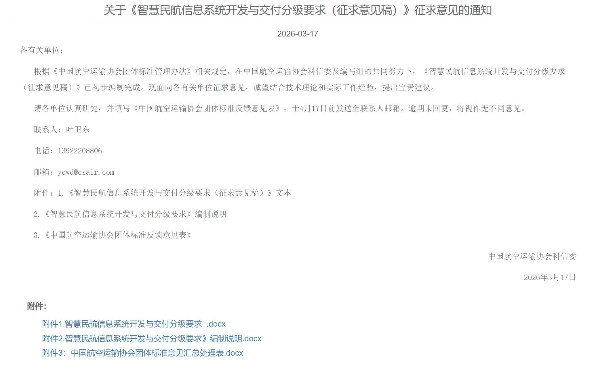 中国航协发布关于《智慧民航信息系统开发与交付分级要求(征求意见稿)》征求意见的通知 政府机构要闻 来源:中国航协 3月18日 编辑 通讯员mk 取消关注 关注 私信 相关推荐: 贵州监管局推动贵阳机场机坪运行安全专项整治 中国航协意见征集