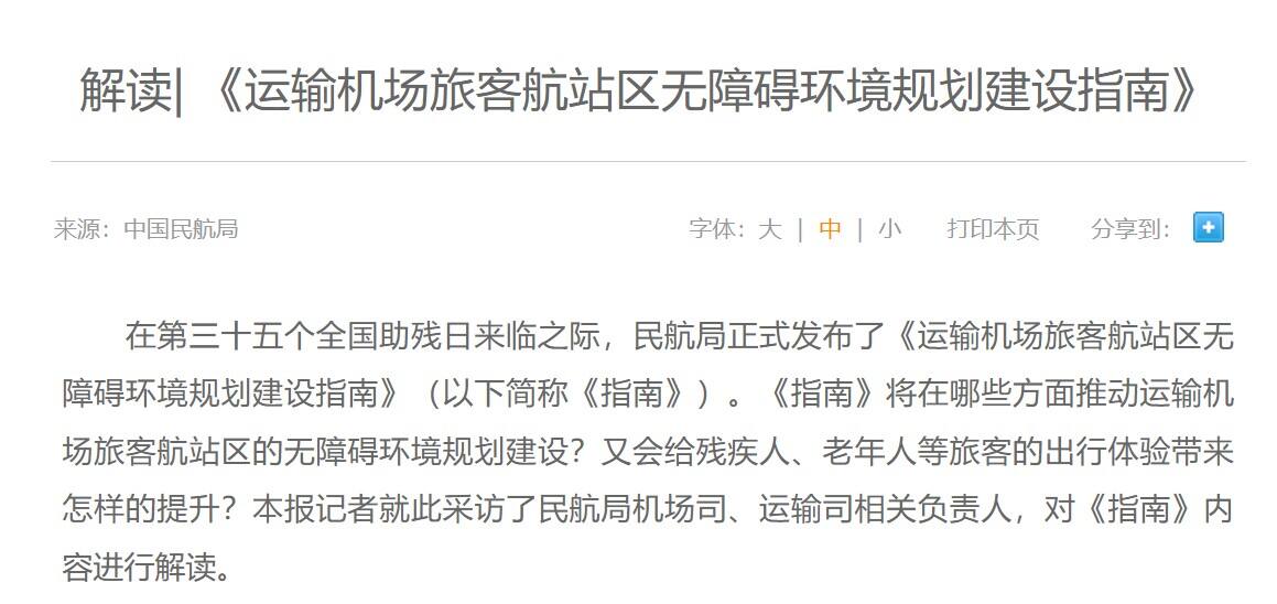 近日,民航局发布了 《关于加强残疾人航空运输保障能力的若干措施(征求意见稿)》,向基层各单位征求加强无障碍保障通道的建议。函件发往民航各地区管理局、各运输航司、机场等单位,并同时抄送中国残联维权部。