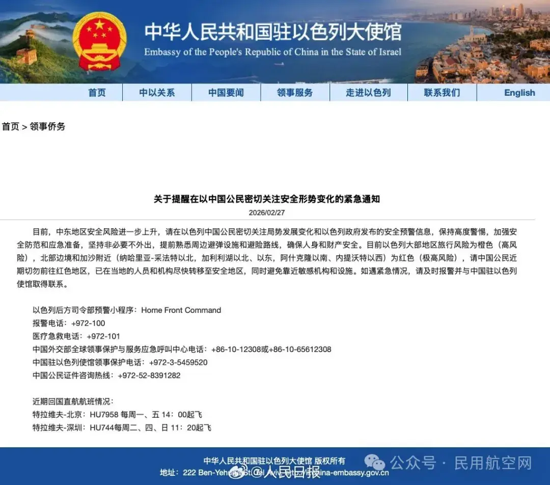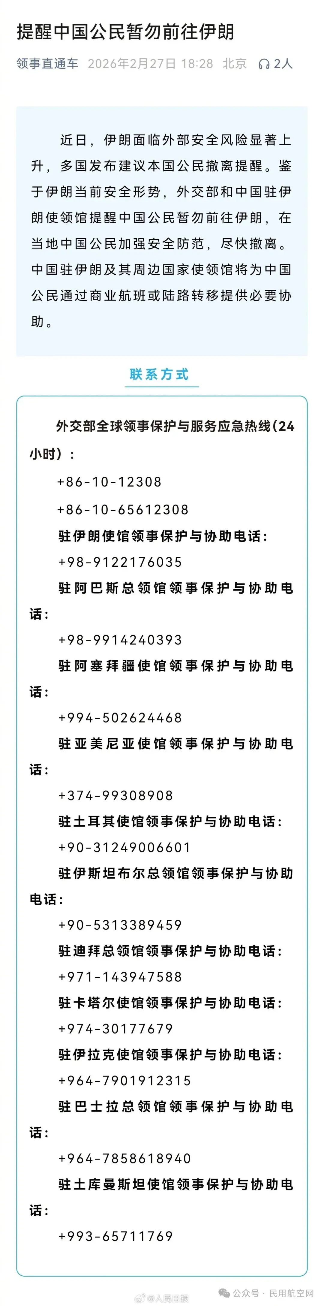 中国外交部及驻伊朗使领馆于2月27日首次明确要求公民"暂勿前往伊朗",并敦促在伊人员"尽快撤离"。该行动与美、德等至少17国同步,美国驻以色列大使馆同日要求非紧急人员撤离。中方同步公布伊朗及周边8国使领馆的24小时联络渠道,提供陆路转移与通关协调支持。