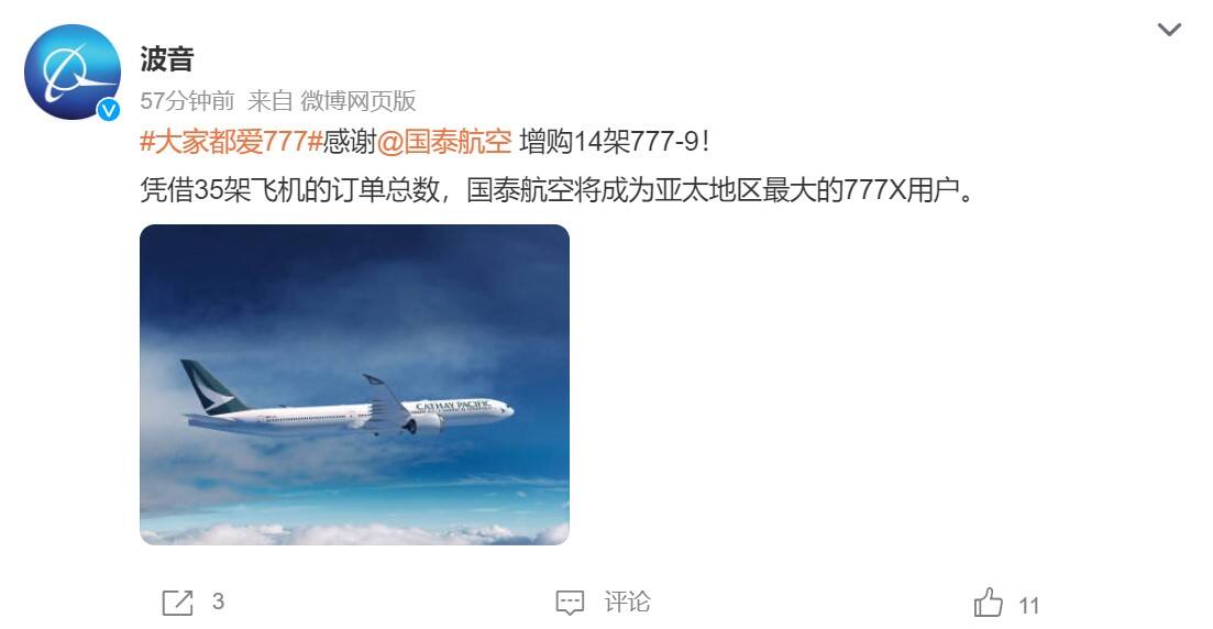 国泰航空增购14架波音777-9 航空制造要闻 订单交付 8月6日 编辑 通讯员mk 取消关注 关注 私信 国泰航空今日宣布行使购买选择权,增购14架777-9客机,使该机型的订购总数达到35架。 国泰航空B777-9