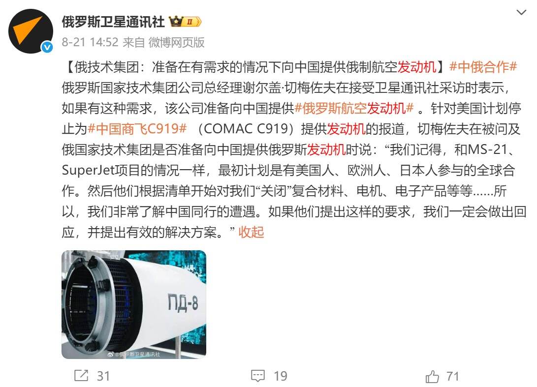 俄罗斯表示:愿向中国提供先进航空发动机 航空制造要闻 25年8月28日 编辑 通讯员mk 取消关注 关注 私信 据俄罗斯卫星通讯社8月21日消息,当天俄技集团总经理谢尔盖·切梅佐夫在接受采访时表示,俄罗斯可以根据需求,向中国提供航空发动机。 切梅佐夫表示,参看俄罗斯自己的SSJ-100、MC-21等项目,一开始采取的都是全球合作模式,但随着时间的推移,这些合作同行开始逐步向俄罗斯“关闭”相关部类的合作,从复合材料、航空发动机到航电系统等——因此,俄技集团非常了解我们面临的处境,并随时准备根据我们的要求,提出相关的技术解决方案。 发动机